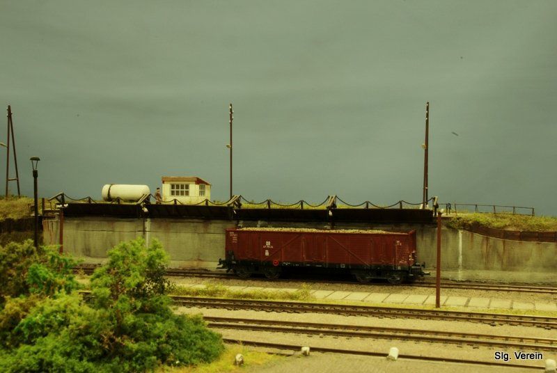 Ein markantes Detail fanden wir am spitzen Bahnsteigende. Hier stand eine sich eine Pumpanlage zur Wasserversor-gung der Dampflokomotiven. Das Wasser wurde mittels einer elektrischen Pumpe über ein Standrohr und flexiblen Schlauch in die Wasserkästen der Loks gepumpt. Die Bauform erinnert an einen Elefantenrüssel und war wohl das auffälligste Teil des Bahnhofs.